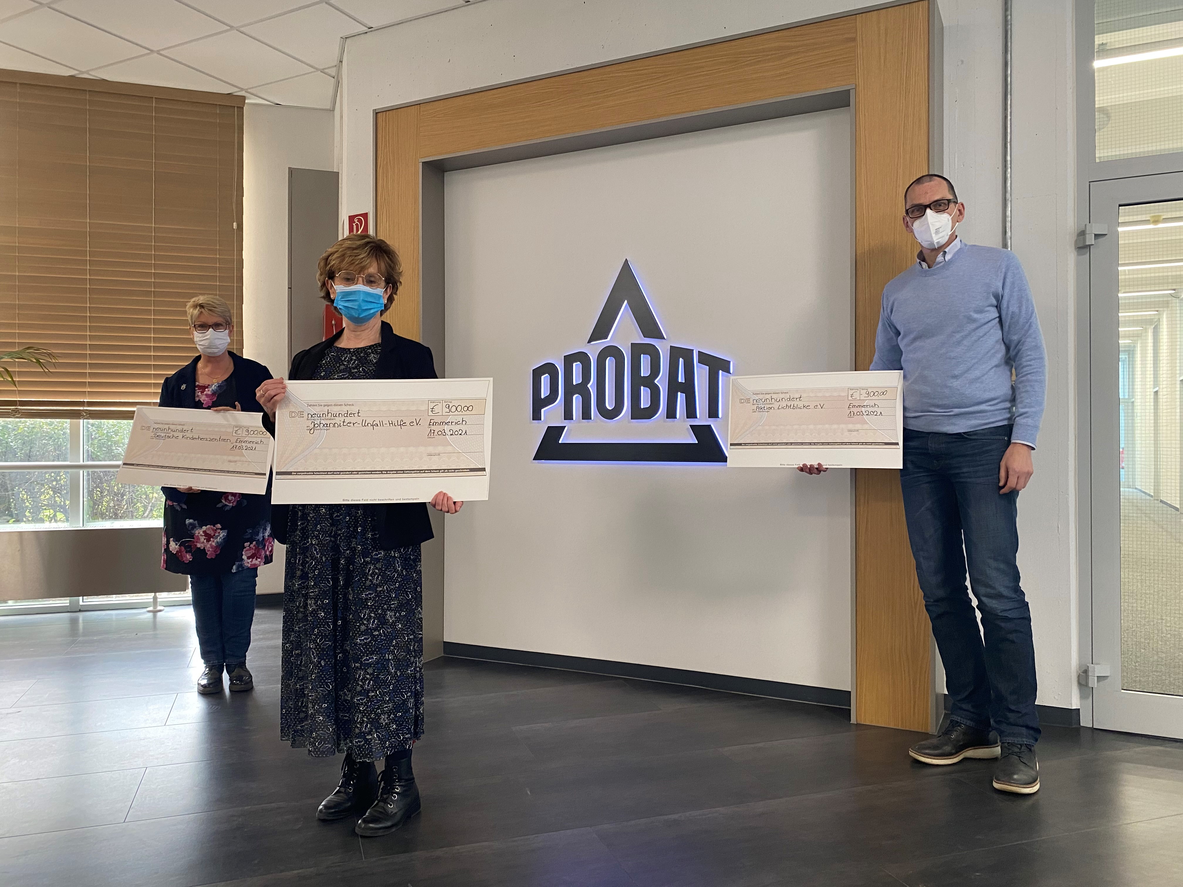 Emmerich am Rhein, März 2021: Die Mitarbeiter der PROBAT-Werke in Emmerich spenden den Erlös einer Tombola an gemeinnützige Organisationen: Insgesamt 2.700 Euro gehen zu gleichen Teilen an die Aktion Lichtblicke e.V., die Johanniter-Unfall-Hilfe e.V. und die Fördergemeinschaft Deutsche Kinderherzzentren e.V.